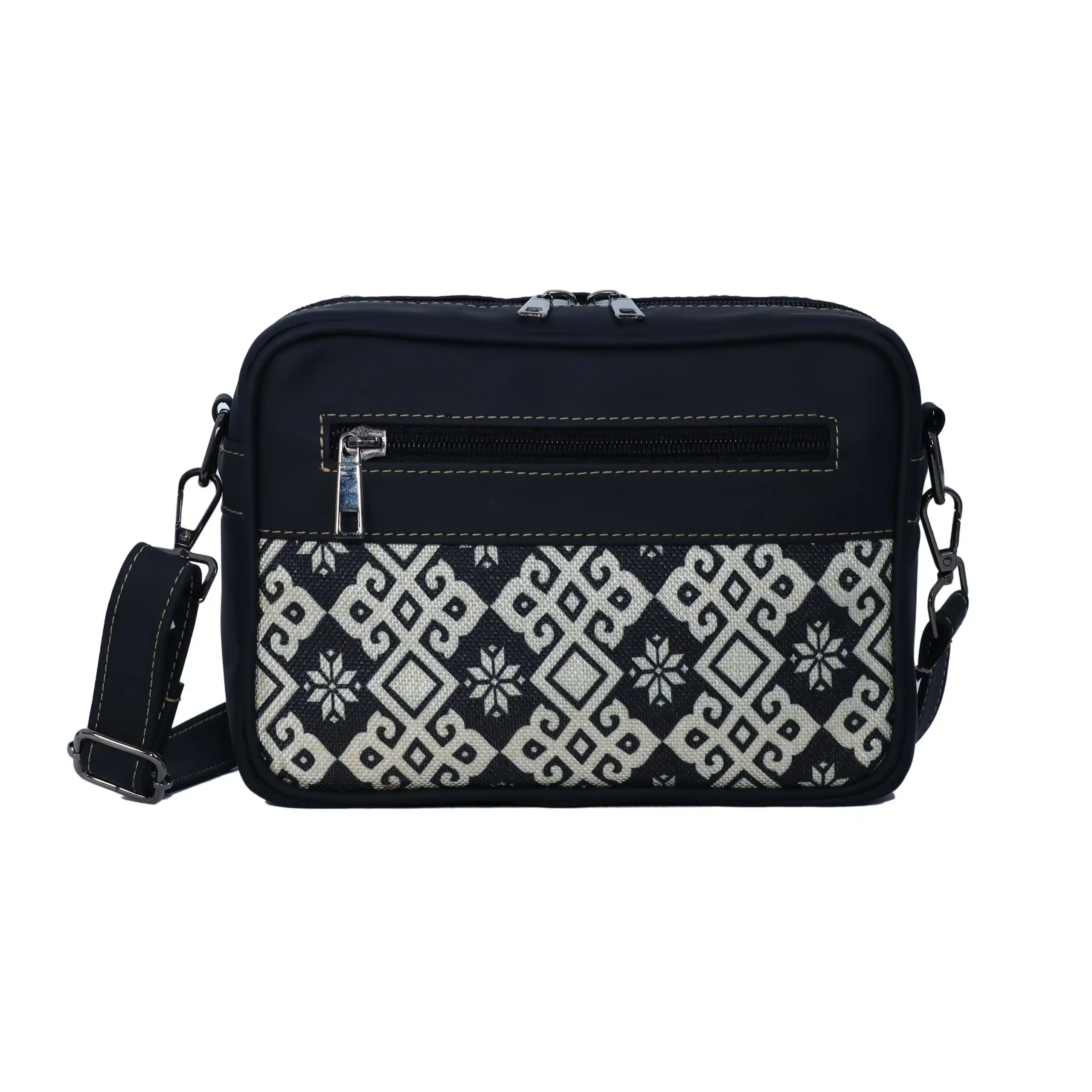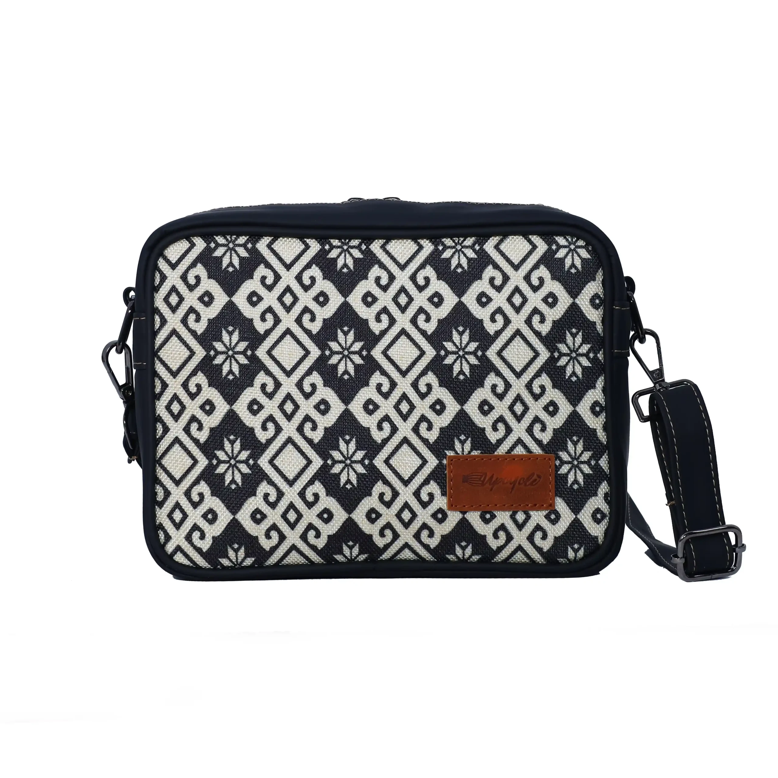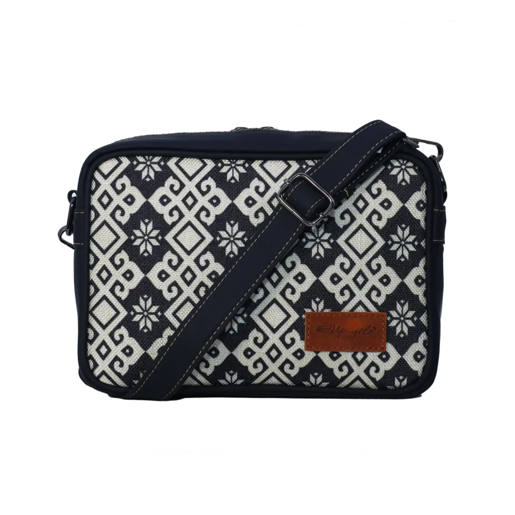 Aztec Jute Serene Sling Bag with Aztec print design, featuring a backside zip pocket, inner zip compartment, short utility pocket. Compact yet spacious with a sturdy build for everyday use.